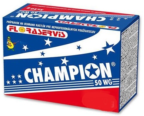 CHAMPION 50 WG je fungicídny prípravok na báze hydroxidu meďnatého s kontaktným a preventívnym účinkom. Meď obsiahnutá v účinnej látke inhibuje rozvoj a rast chorôb zapríčinených hubovými a bakteriálnymi patogénmi narúšaním ich enzýmového systému. Meď je účinnejšia viac na spóry ako samotné mycélium, preto musí byť aplikovaná ešte pred očakávaným výskytom infekcie. Prípravok po aplikácii vytvára na rastline dobre viditeľný, jemný, rovnomerne rozložený film, ťažko zmývateľný dažďom, čím chráni rastlinu aj za nepriaznivého počasia.Postrekový kontaktný fungicídny prípravok vo forme vodou dispergovateľných granúl určený na ochranu rajčiaka, uhorky, chmeľu, viniča, zemiaka a broskyne proti hubovým chorobám.ÚČINNÁ LÁTKA: