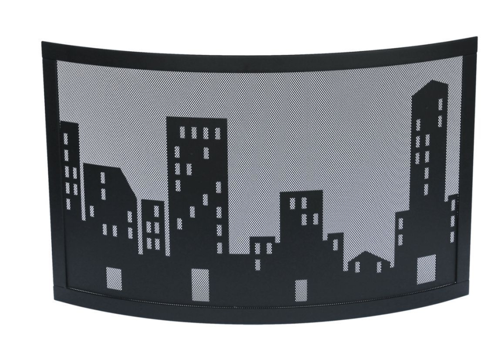 Kvalitný zaoblený krbový paraván s motívom Metropole - ochranná zástena pred krby a kachle od rakúskej značky Lienbacher, farba čierna. Výška: 48 cm Šírka: 75 cm