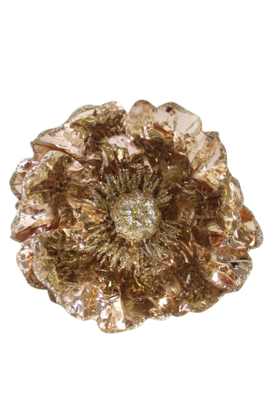 Ružovo-zlatá magnólia je originálna ozdoba na vianočný stromček. Tento vianočný kvet môžete použiť aj ako dekoráciu do vianočných aranžmánov a adventných vencov. Na zadnej strane sa nachádza štipec pre jednoduché uchopenie.